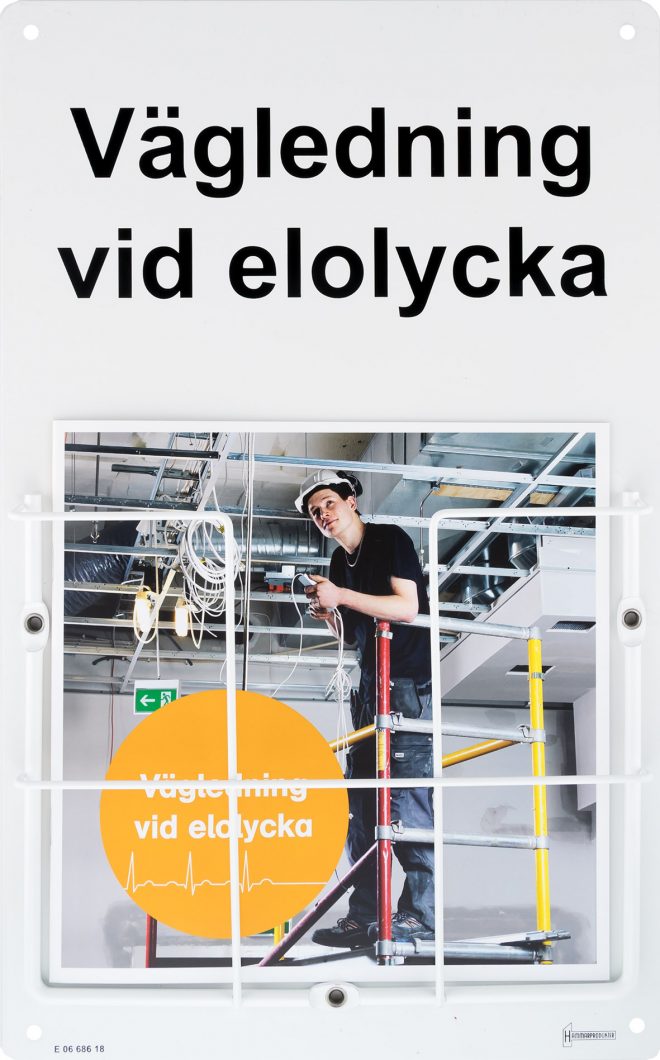 Placeras på lämplig väggyta. Elsäkerhetsverkets broschyr ”Vägledning vid elolycka” är placerad i broschyrfacket.