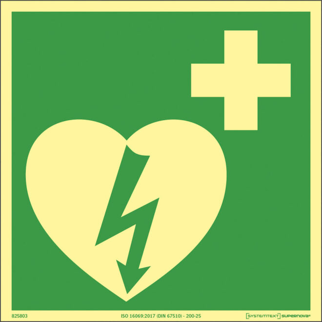 Skylt Defibrillator, efterlysande aluminium. Enligt AFS 2020:1.